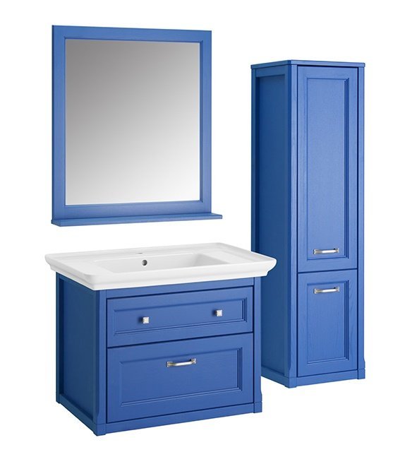 Комплект мебели из массива ясеня ASB-Woodline Толедо 85 в красивом синем оттенке (smalt) имеет изысканный внешний вид и отличную функциональность. Оснащённый двумя предметами – навесным зеркалом со встроенной в деревянной раме полочкой и подвесной тумбой с раковиной, набор обеспечивает все необходимые нужды для комфортного каждодневного умывания. Внутри тумбы установлены два вместительных ящика с механизмом плавного и бесшумного выдвижения.